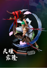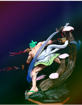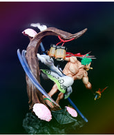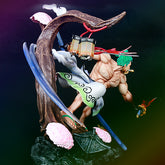 A: las características de la figura Zoro en postura de batalla, con Tres espadas, a base de la flor de cerezo, y efectos brillantes.