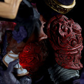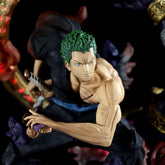 - Pose de acción épica: La pose dinámica de Zoro con efectos de la llama y múltiples armas captura su espíritu guerrero.