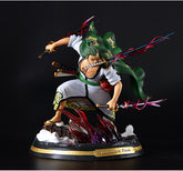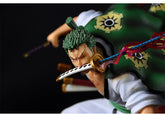 - Pose de espada dinámica: Características Las icónicas tres espadas de Zoro, capturado en una pose de acción dramática.