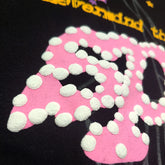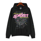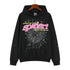 Featuring a fuzzy pink chenille “sp5der!” logo with playful polka dots and the phrase “Nevermind the punk, here’s the slime”, this hoodie embodies Sp5der’s fearless aesthetic. Beneath the logo, a large white spider-web print stretches across the chest, accented by yellow and blue star details that add dynamic contrast to the dark backdrop.