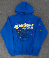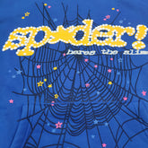 Turn heads with the Sp5der “Hares the Slime” Hoodie, a bold expression of streetwear creativity. This royal-blue heavyweight hoodie features a textured yellow fuzzy “sp5der!” logo front and center, accented by a black spider-web graphic and colorful star details.