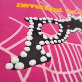 Iconic “sp5der!” rhinestone-style print with bright yellow and pastel web details.