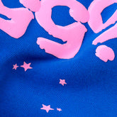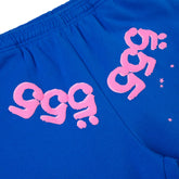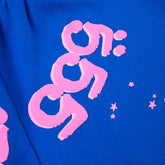 The solid blue base delivers a bold yet versatile look, while the pink Sp5der logo positioned at the upper back creates strong contrast and instant brand recognition. Scattered star accents add subtle texture and visual movement across the fabric. Finished with a relaxed silhouette, elastic waistband, and elastic cuffs, these jogger pants offer a comfortable fit ideal for casual outfits, lounging, or modern streetwear styling.