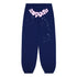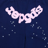The deep navy blue base creates a clean and versatile foundation, highlighted by a soft pink Sp5der logo graphic placed across the upper leg area. Small white star details are scattered across the fabric, adding movement and subtle contrast to the overall design. Finished with a relaxed silhouette, elastic waistband, and elastic cuffs, these sweatpants are ideal for casual wear, lounging, or effortless streetwear styling.