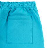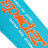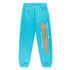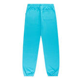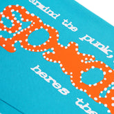 The teal blue base creates a clean and vibrant look, while the vertical orange Sp5der logo features a dotted print texture that adds visual depth and contrast. Subtle star details are scattered across the fabric, enhancing the design without overwhelming its minimalist structure. The relaxed silhouette, elastic waistband, and elastic cuffs ensure a comfortable and flexible fit for casual wear, lounging, or street styling.