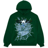 This dark green graphic hoodie features a bold spider web print design that instantly stands out while maintaining a clean, wearable aesthetic. The intricate web graphic is layered with subtle star-like details, creating a visually striking yet balanced look.