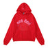 The bright red fleece base, contrasted by bubblegum pink lettering and a spiderweb graphic, brings a vibrant Y2K streetwear aesthetic to life.