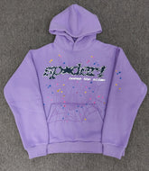 This premium heavyweight hoodie features the signature fuzzy chenille “sp5der!” logo across the chest, styled in bold black and white polka-dot texture. Beneath it, a large purple spider-web print spreads across the front with colorful mini stars — a perfect balance between playful and edgy design.