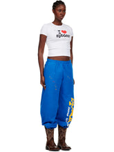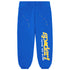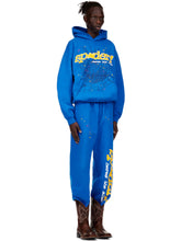These Sp5der sweatpants feature a bold and energetic streetwear look in a vibrant blue colorway. The design is highlighted by a vertical yellow Sp5der logo printed along one leg, detailed with dotted accents, while multicolor star graphics are scattered across the upper legs to add playful contrast and visual depth.