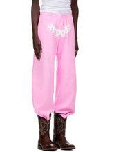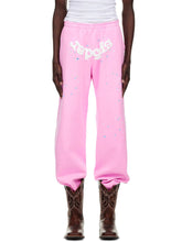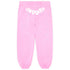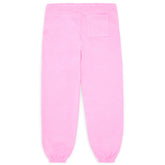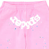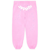 These Sp5der sweatpants feature a softer, playful streetwear look in a light pink colorway. Designed with a bold Sp5der logo print positioned across the upper front, they stand out with a clean layout accented by scattered star details along the legs, adding subtle visual texture.