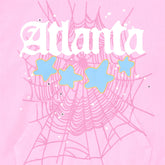 It features a white gothic “Atlanta” logo, a large pink spider-web print, and three 3D puff aqua-blue stars accented with neon yellow outlines.