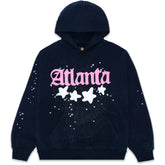 Designed in a deep navy blue base, the hoodie features a bold pink gothic “Atlanta” logo above Sp5der’s signature web and star motifs, bringing a perfect balance of street grit and dreamy charm.