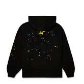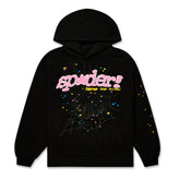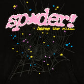 Featuring a fuzzy pink chenille “sp5der!” logo with playful polka dots and the phrase “Nevermind the punk, here’s the slime”, this hoodie embodies Sp5der’s fearless aesthetic. Beneath the logo, a large white spider-web print stretches across the chest, accented by yellow and blue star details that add dynamic contrast to the dark backdrop.